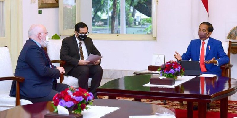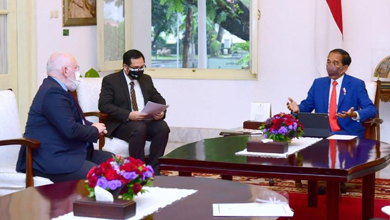 Presiden Joko Widodo (Jokowi) menerima Wakil Presiden Eksekutif Komisi Eropa untuk Kebijakan Hijau Eropa dan Iklim Frans Timmermans di Istana Merdeka. Jokowi menegaskan komitmen Indonesia dalam mengatasi perubahan iklim.